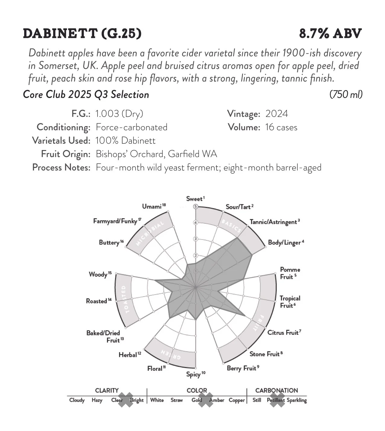 Dabinett apples have been a favorite cider varietal since their 1900-ish discovery in Somerset, UK. Apple peel and bruised citrus aromas open for apple peel, dried fruit, peach skin and rose hip flavors, with a strong, lingering, tannic finish.
