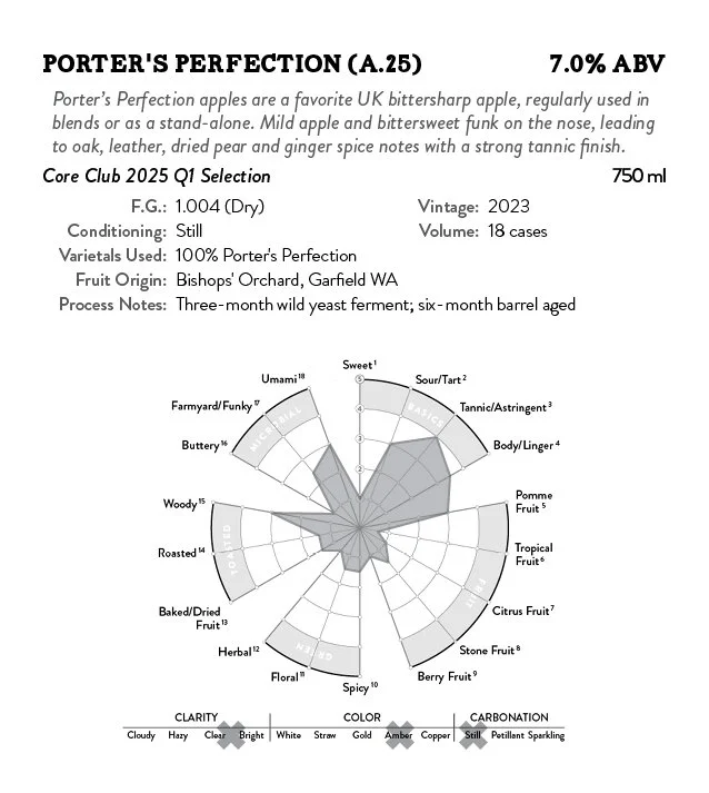Porter’s Perfection apples are a favorite UK bittersharp apple, regularly used in blends or as a stand-alone. Mild apple and bittersweet funk on the nose, leading to oak, leather, dried pear and ginger spice notes with a strong tannic finish.