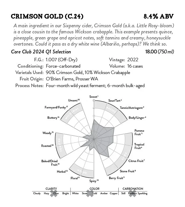 Taste, of course, is a highly subjective thing. But cider making is an art and a science. Cider apples have unique flavor characteristics - which for nerds like us - are worth noting, helping expand our appreciation and enjoyment of each cultivar. Tasting notes can also identify how apples respond to growing conditions – helping us make better, more delicious choices in how and where to grow varietals. This library details nearly every cider we’ve made since 2019, using a common “spider chart” format ranking 18 criteria ranging from basics like sweetness, tartness and astringency to how each cider recalls other fruit and spice categories. Members of our Core Club receive copies of these with each shipment, along with a crib sheet providing background on how we define our criteria - making it easy and fun for fans to compare their experiences with ours.