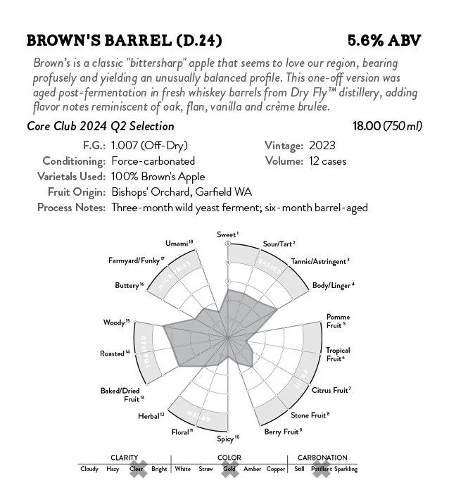 Brown’s is a classic "bittersharp" apple that seems to love our region, bearing profusely and yielding an unusually balanced profile. This one-off version was aged post-fermentation in fresh whiskey barrels from Dry Fly™ distillery, adding flavor notes reminiscent of oak, flan, vanilla and crème brulée.