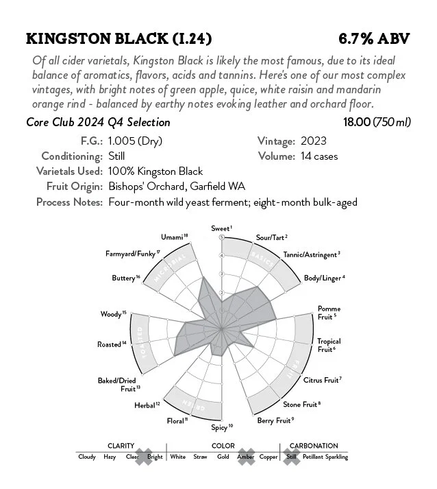 Taste, of course, is a highly subjective thing. But cider making is an art and a science. Cider apples have unique flavor characteristics - which for nerds like us - are worth noting, helping expand our appreciation and enjoyment of each cultivar. Tasting notes can also identify how apples respond to growing conditions – helping us make better, more delicious choices in how and where to grow varietals. This library details nearly every cider we’ve made since 2019, using a common “spider chart” format ranking 18 criteria ranging from basics like sweetness, tartness and astringency to how each cider recalls other fruit and spice categories. Members of our Core Club receive copies of these with each shipment, along with a crib sheet providing background on how we define our criteria - making it easy and fun for fans to compare their experiences with ours.