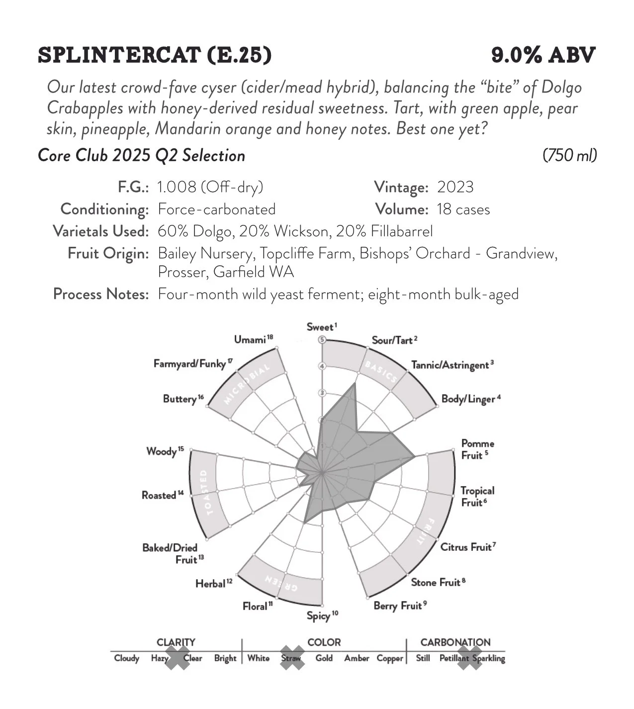 Taste, of course, is a highly subjective thing. But cider making is an art and a science. Cider apples have unique flavor characteristics - which for nerds like us - are worth noting, helping expand our appreciation and enjoyment of each cultivar. Tasting notes can also identify how apples respond to growing conditions – helping us make better, more delicious choices in how and where to grow varietals. This library details nearly every cider we’ve made since 2019, using a common “spider chart” format ranking 18 criteria ranging from basics like sweetness, tartness and astringency to how each cider recalls other fruit and spice categories. Members of our Core Club receive copies of these with each shipment, along with a crib sheet providing background on how we define our criteria - making it easy and fun for fans to compare their experiences with ours.