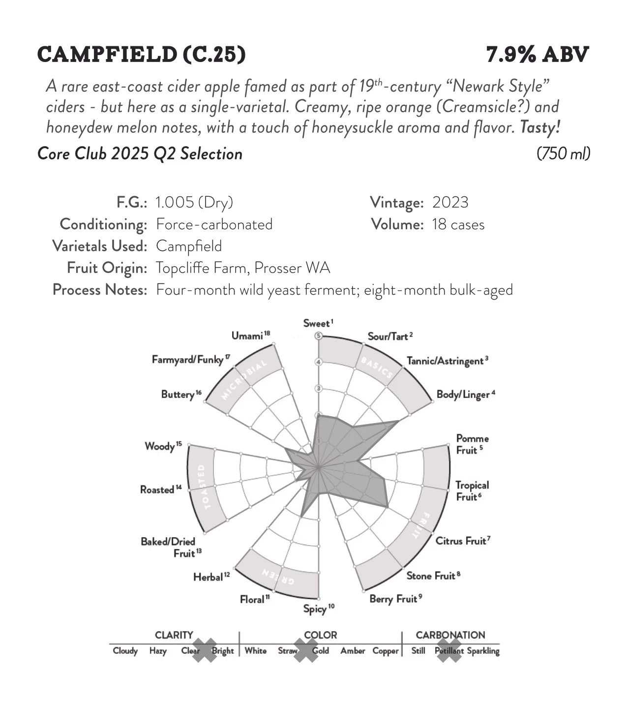 Taste, of course, is a highly subjective thing. But cider making is an art and a science. Cider apples have unique flavor characteristics - which for nerds like us - are worth noting, helping expand our appreciation and enjoyment of each cultivar. Tasting notes can also identify how apples respond to growing conditions – helping us make better, more delicious choices in how and where to grow varietals. This library details nearly every cider we’ve made since 2019, using a common “spider chart” format ranking 18 criteria ranging from basics like sweetness, tartness and astringency to how each cider recalls other fruit and spice categories. Members of our Core Club receive copies of these with each shipment, along with a crib sheet providing background on how we define our criteria - making it easy and fun for fans to compare their experiences with ours.